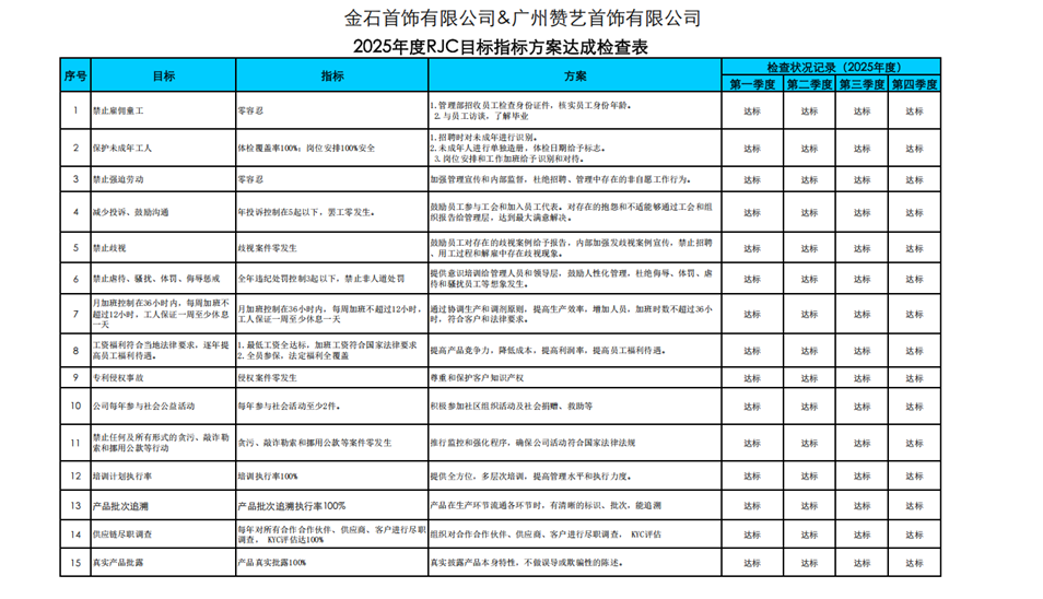 [Kam Shek Jewellery Co., Ltd.& Guangzhou Zanyi Jewelry Co., Ltd.] conducted a human rights training session for [employees and/or contractors] on [February 26, 2025], covering [RJC standards and human rights requirements]. Additionally, we organized a due diligence training program for all [employees and/or contractors] on [June 26, 2025], which included [the company's obligation to monitor supplier business relationZYips to prevent serious violations of social responsibility standards, such as child labor, prison labor, and other forms of forced labor, as well as policies against conflict minerals, money laundering, bribery, and fraud. All suppliers, subcontractors, and labor agencies are prohibited from using child labor, forced labor, bonded labor, or prison labor, and must not retain employees' original identification documents or personal data]. The training was specifically designed for all employees and conducted annually.